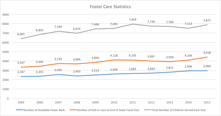 According to most recent Arkansas Department of Human Services reports, the number of children served by the foster care system has risen by nearly 1,400 children from 2005 to 2015. The number of children in care each fiscal year has gone up by over 1,000 children, while the number of open beds has risen by just over 600.