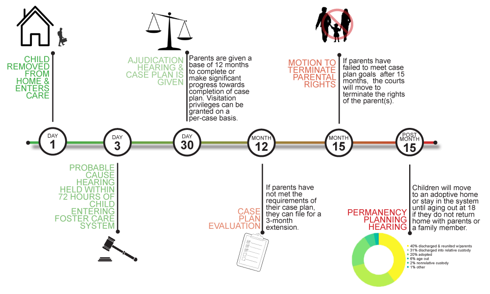 The Foster Care Timeline The foster care timeline can be confusing. Check out the timeline below to gain a better understanding of the basic structure of the foster care system. Like Loading...